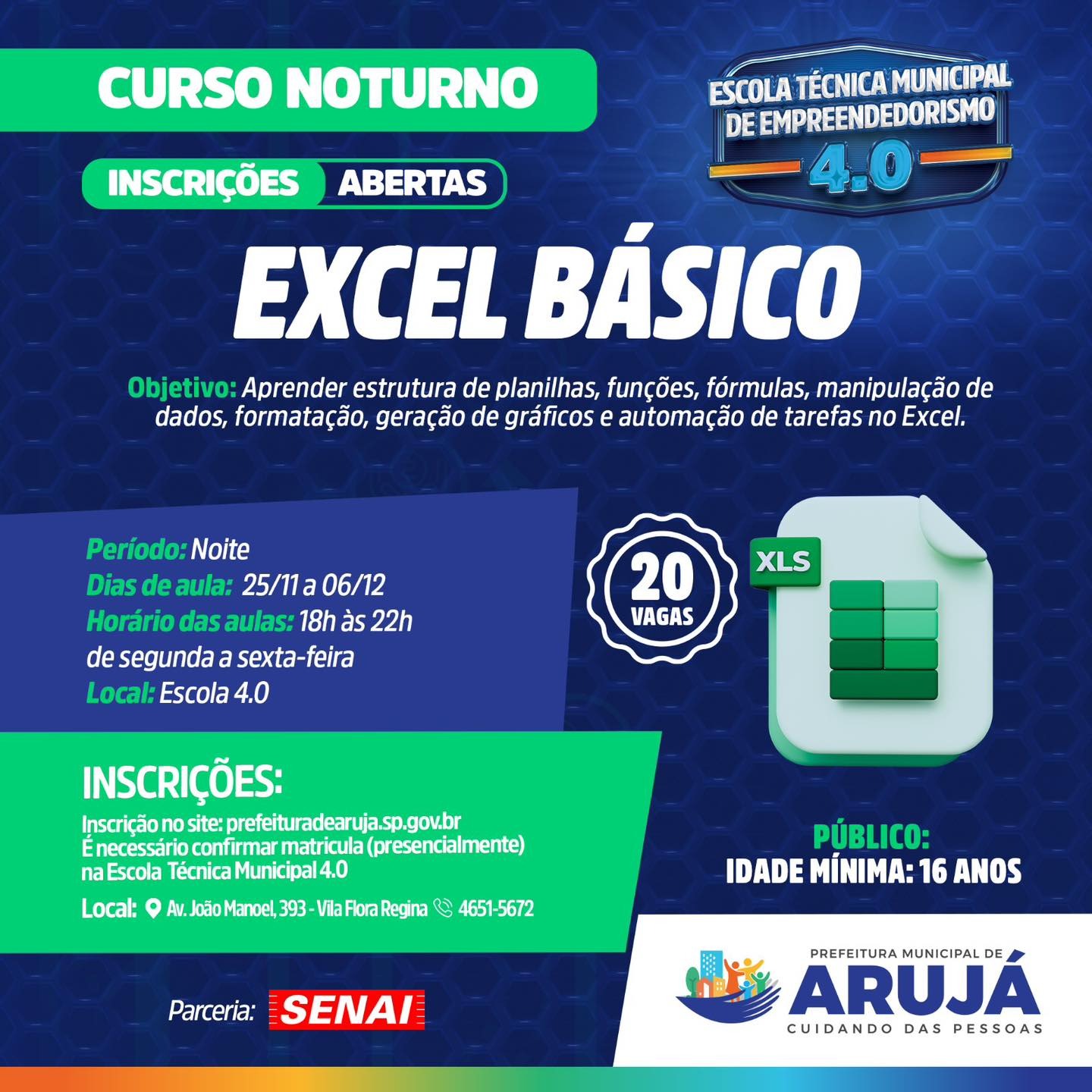 Estão abertas as inscrições para o curso gratuito de “Excel Básico” na Escola Técnica Municipal 4.0, uma iniciativa da Prefeitura de Arujá, por meio da Secretaria Municipal de Desenvolvimento Econômico, em parceria com o SENAI – Serviço Nacional de Aprendizagem Industrial. As aulas ocorrerão de segunda a sexta-feira, das 18h às 22h, no período de 25 de novembro a 6 de dezembro, com 20 vagas disponíveis.