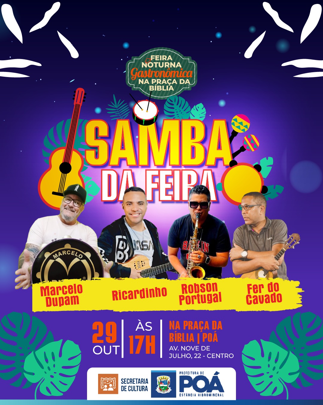 A Feira Gastronômica Noturna de Poá já é um grande sucesso e nesta terça-feira (29) traz um samba especial com os cantores Marcelo Dupam, Ricardinho, Robson Portugal e Fer do Cavado. A atração acontece das 17 às 23 horas, na Praça da Bíblia.