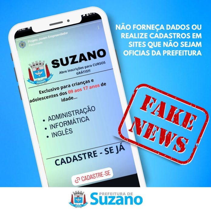 A Prefeitura de Suzano, por meio das Secretarias Municipais de Administração e de Comunicação Pública, emitiu um alerta à população nesta quarta-feira (16/04) a respeito de uma informação falsa que tem circulado nas redes sociais. A mensagem menciona a existência de vagas gratuitas em cursos de Administração, Informática e Inglês para crianças e adolescentes, com inscrição por meio de um suposto cadastro on-line.